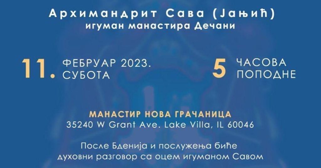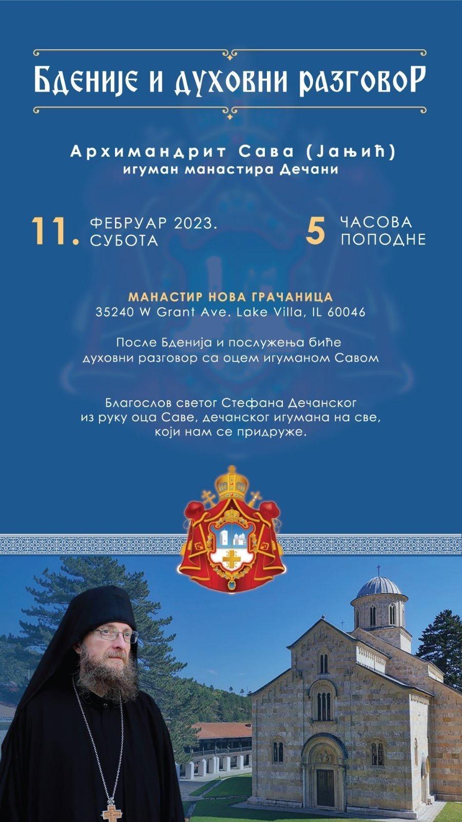 Бденије и духовни разговор: Манастир Нова Грачаница, субота, 11. фебруар, 5:00 увече